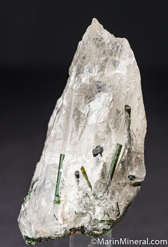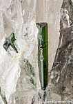 Partial transparent Quartz crysal shot through with gemmy green Tourmaline crystals. Lots of crystal within the Quartz and covering the base of the Quartz. Could be used as a specimen or a carving piece.