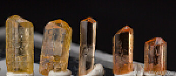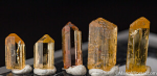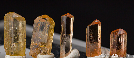 Ten crystals of Imperial Topaz. Though small, they are high quality transparent crystals. All are terminated and undamaged or relatively undamaged.