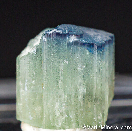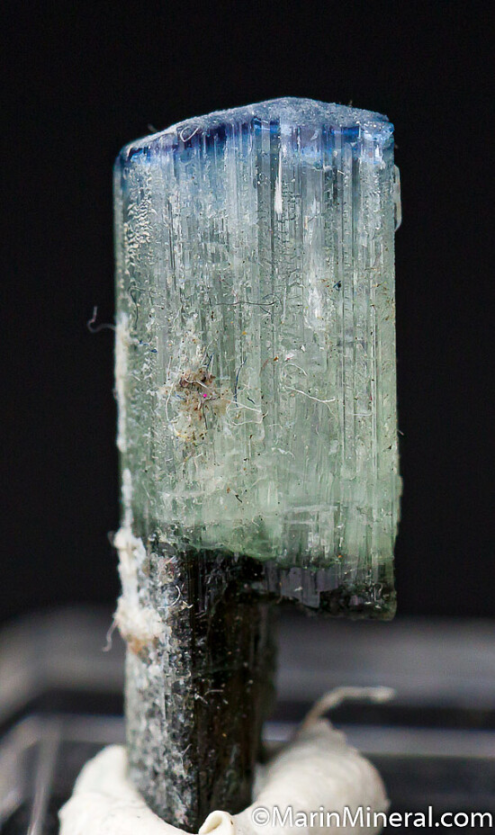 Three crystals of Dravite from Mwajanga. The first is a 2cm greenish crystal with a white cat's-eye termination. The other two are blue-cap Dravites from a unique 2017 find. A good representative suite from the mine.