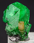 A 1.4cm Tsavorite crystal on Graphite with a small partial yellow Zoisite crystals atttached. The combination of Zoisite with Tsavorite is uncommon. Contacted on the backside. The Tsavorite has glassy faces and superb color.
