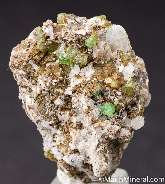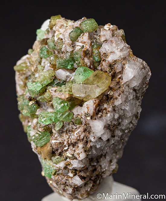 This is a really fun Merelani Tsavorite specimen with at least 25 Tsavorite crystals, Pyrite, Diopside, small white crystals of what I beleive are Apatite, and Calcite, possibly more minerals too. The crystals are present on all sides. Valued at $250.