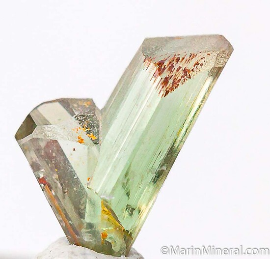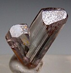 V-twin crystal of color change Diaspore. From new finds in the mountains near Milas, these new Diaspore crystals are spectacular in color and form and one of the most exciting recent finds. Complete all around with perfect undamaged terminations. Medium purple color in natural sunlight and greenish gold in incandescent lighting.