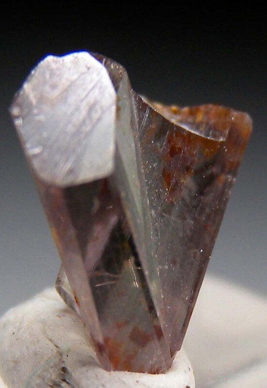 Newly found purple color change Diaspore crystal. These new crystals are really fantastic - terminated V-twin crystals with a more purple/lavender color in natural sunlight and a more greenish yellow color in incandescent light. Before this find it was very rare to get a terminated V-twin crystal. Bright and gemmy, good on both sides. One termination shows some chipping, otherwise perfect all around.