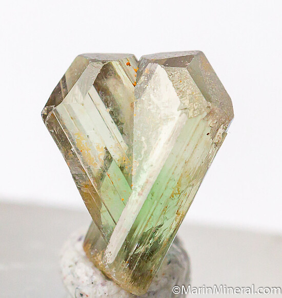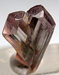 V-twin crystal of color change Diaspore. From new finds in the mountains near Milas, these new Diaspore crystals are spectacular in color and form and one of the most exciting recent finds. Complete all around with perfect undamaged terminations. Medium purple color in natural sunlight and greenish gold in incandescent lighting.