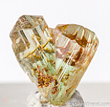 Newly found purple color change Diaspore crystal. These new crystals are really fantastic - terminated V-twin crystals with a more purple/lavender color in natural sunlight and a more greenish yellow color in incandescent light. Before this find it was very rare to get a terminated V-twin crystal. Bright and gemmy. Both terminations are perfect perfect, backside has a bit of irregular growth and some iron stains, but good.