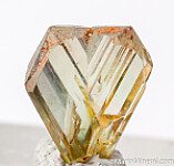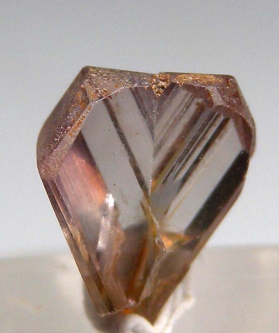V-twin crystal of color change Diaspore. From new finds in the mountains near Milas, these new Diaspore crystals are spectacular in color and form and one of the most exciting recent finds. Complete all around with perfect undamaged terminations. Medium purple color in natural sunlight and greenish gold in incandescent lighting. A little jewel.