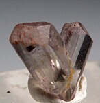 V-twin crystal of color change Diaspore. From new finds in the mountains near Milas, these new Diaspore crystals are spectacular in color and form and one of the most exciting recent finds. Complete all around with perfect undamaged terminations. Medium purple color in natural sunlight and greenish gold in incandescent lighting.