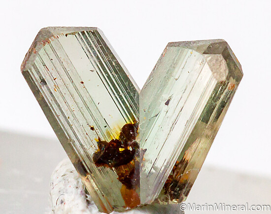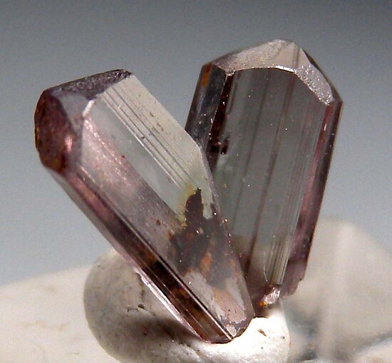 V-twin crystal of color change Diaspore. From new finds in the mountains near Milas, these new Diaspore crystals are spectacular in color and form and one of the most exciting recent finds. Complete all around with perfect undamaged terminations. Medium purple color in natural sunlight and greenish gold in incandescent lighting.