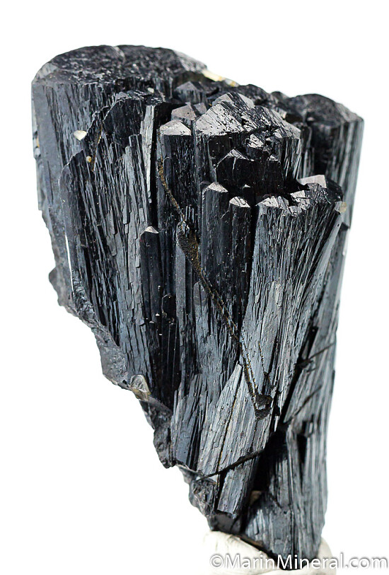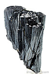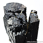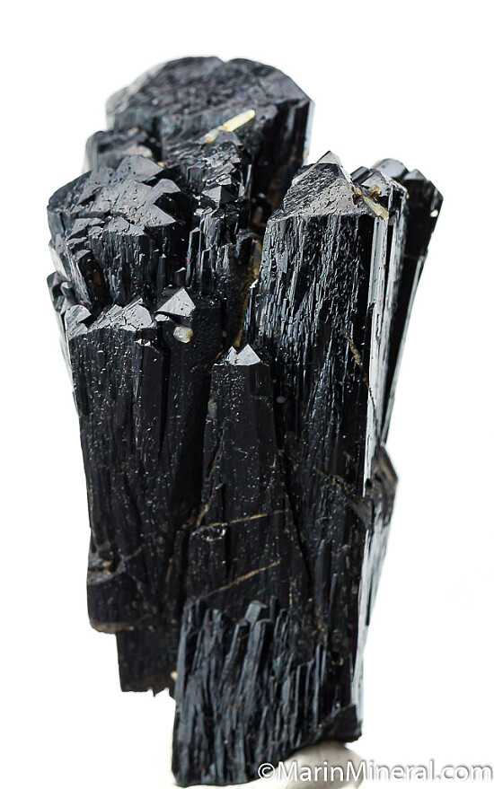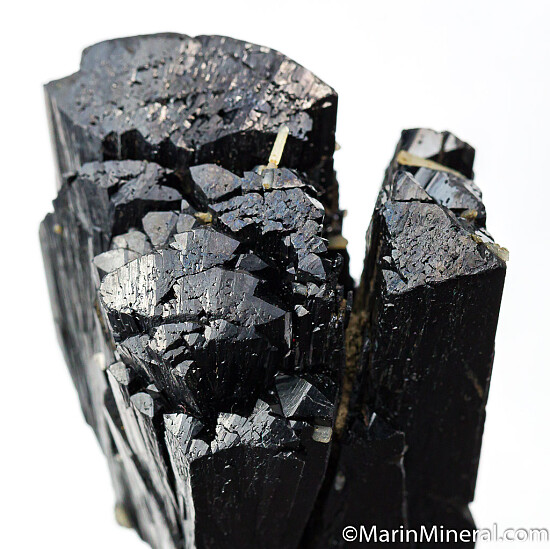 Cluster of thick, glossy black Ilvaite crystals with a few small green Quartz crystals attached. Complete all around.