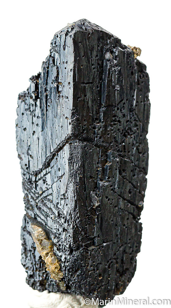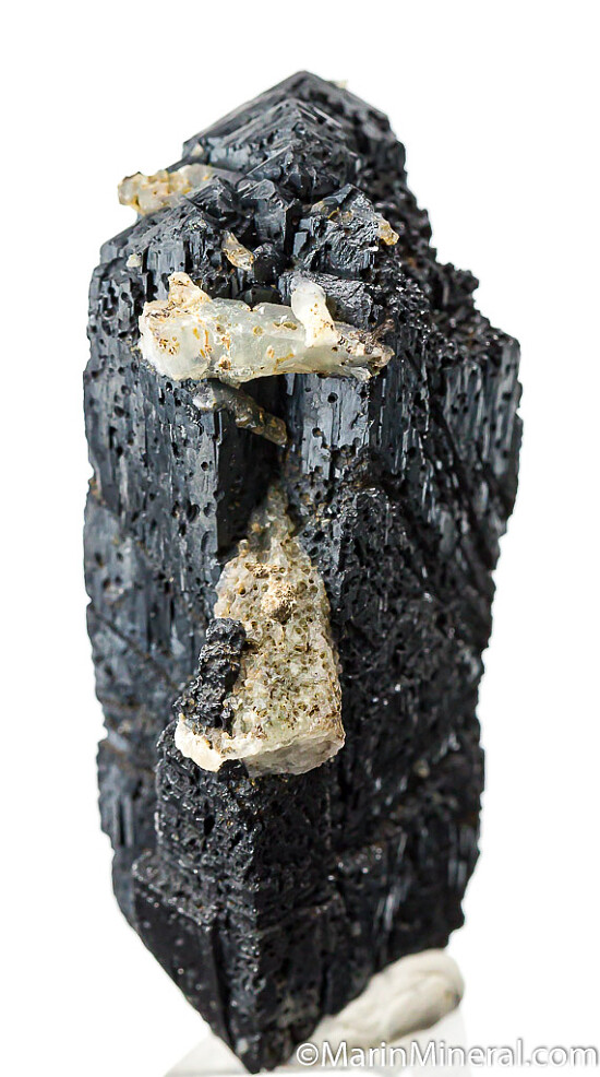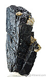 Pair of chunky, glossy black Ilvaite crystals with attached Quartz. Main crystal has a typical chisel shaped termination. Undamaged and complete all around with etching in areas. An undamaged floater that is crystallized on the bottom too.