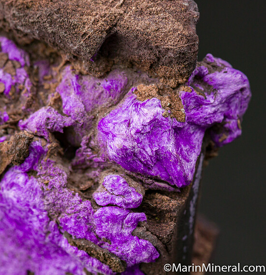 Bright, chatoyant fibrous Sugilite occurring as tightly packed crystals on matrix. Good masses of Sugilite on both sides of specimen. From a rare and limited find in 2014 that produced mostly thumbnail sized specimens. This is a piece that has been stashed away for years and is the largest of this type I've ever had, offered now for the first time.