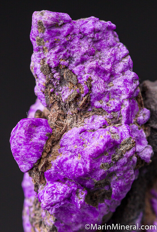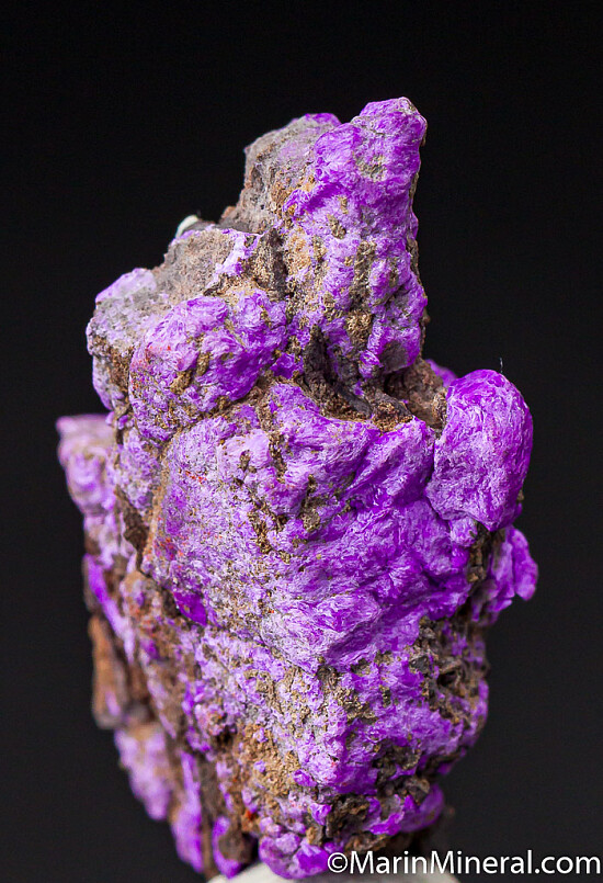 Bright, chatoyant fibrous Sugilite occurring as tightly packed crystals on matrix. Thick masses of Sugilite grown all around small pieces of matrix. From a rare and limited find in 2014.