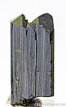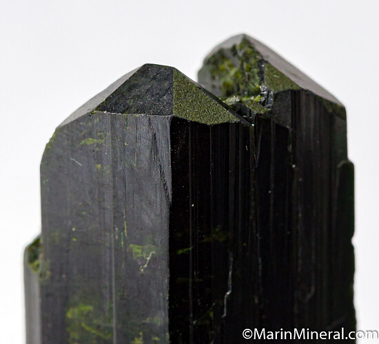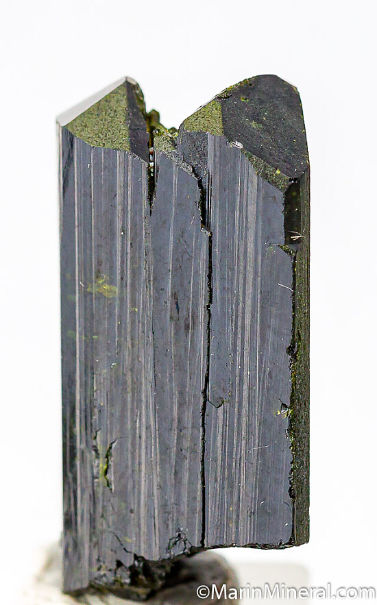 Single glossy black Ilvaite crystal with interesting growth features in the termination. The termination has a valley with green mineralization and lots of smaller sub-terminations. Complete all around and undamaged.