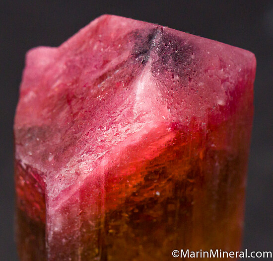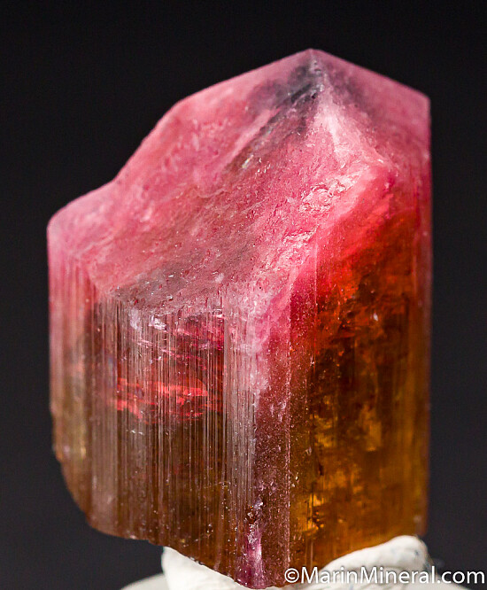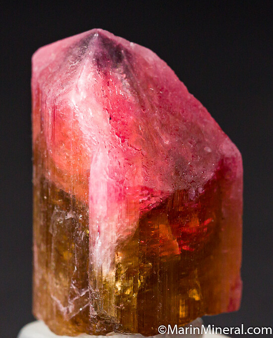Single Tourmaline crystal with a yellow/brown base and pink termination. Slight chipping on one edge otherwise undamaged. Complete all around. Weighs 16.18 grams.