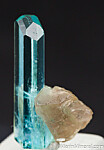 Transparent Aquamarine crystal attached to a smokey Quartz crystal. The Aquamarine is unusualy transparent, perfect and undamaged with good color, especially for a small size. The Smokey Quartz shows good termination faces on the front, is contacted at the back. A sweet little gem of a thumbnail!