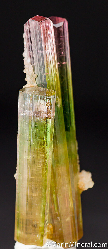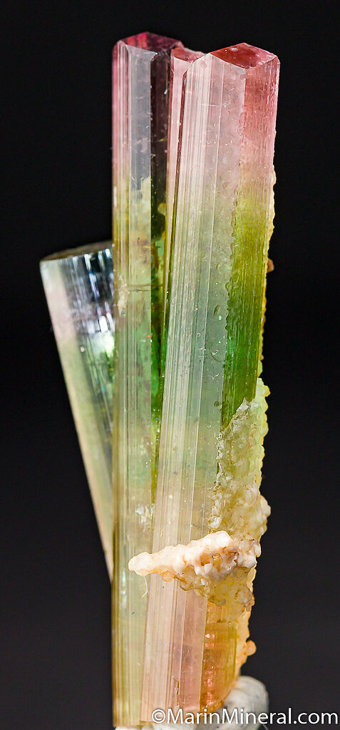 Highly aesthetic cluster of 4 intergrown Tourmaline crystals with alternating colors of green and red. Interestingly, the taller crystals have more typical terminations and the shortest crystals has a more flat termination face. Undamaged.