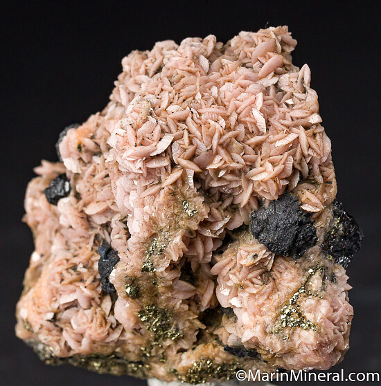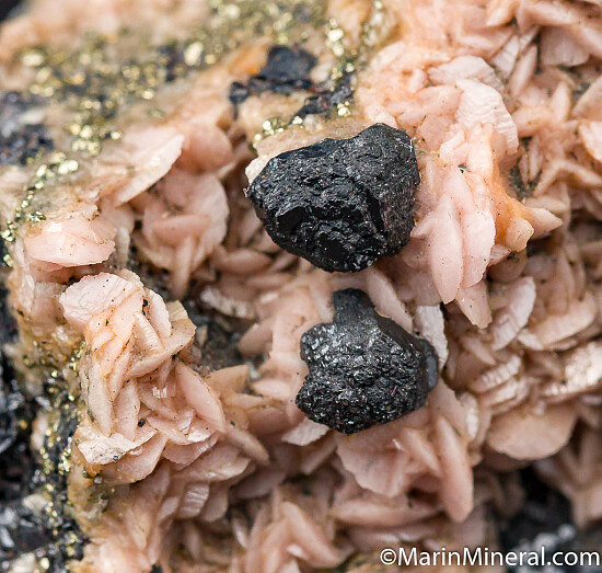 Sphalerite crystals on lenticular pink Rhodochrosite on a pyrite matrix. An old classic from Gilman.