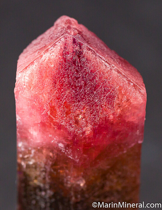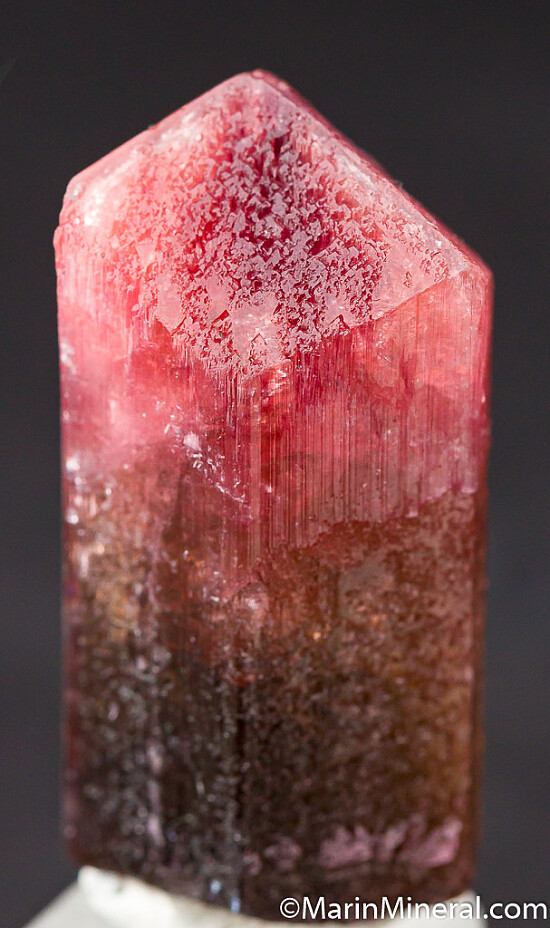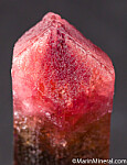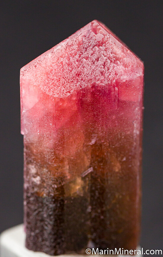 Single Tourmaline crystal with a yellow/brown base and pink termination. Translucent to transparent with strong color (the yellow zone is transparent and the pink zone is more translucent). Complete all around and undamaged. Weighs 19.7 grams.