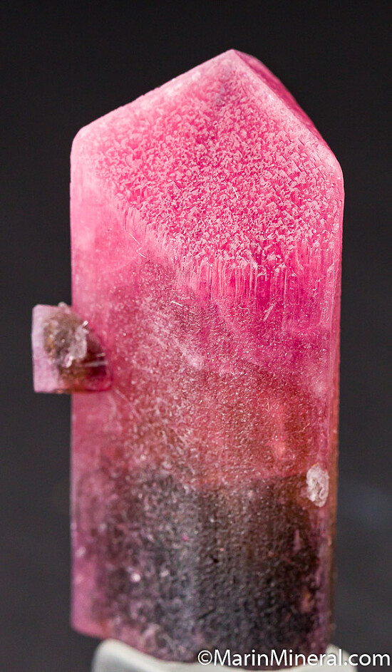 Single Tourmaline crystal with a yellow/brown base and pink upper half. Transluscent with bright coloration. This crystal has a frosted surface luster due to a thin layer of second generation Tourmaline growth on the surface. There is also a small Tourmaline attached to the side. Complete all around and undamaged. Weighs 47.1 grams.