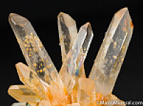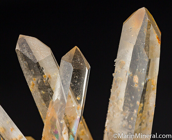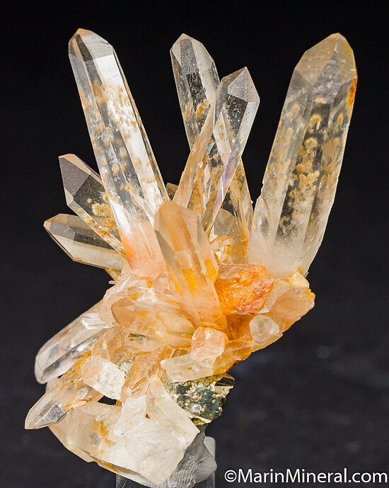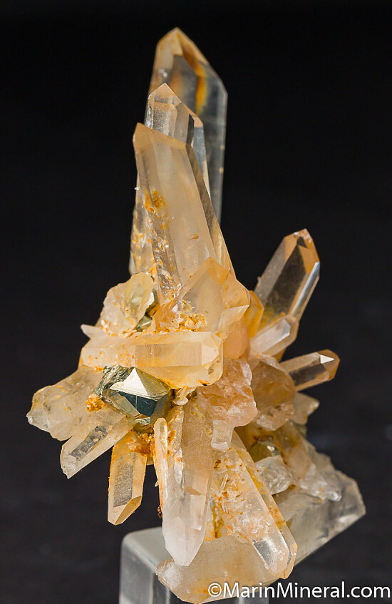 Elegant cluster of transparent Quartz crystals with a number of Pyrite crystals at the base. Out of a 1980s era collection and comes with an old Kassionas Minerals label.