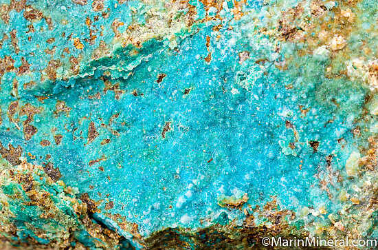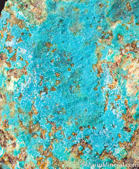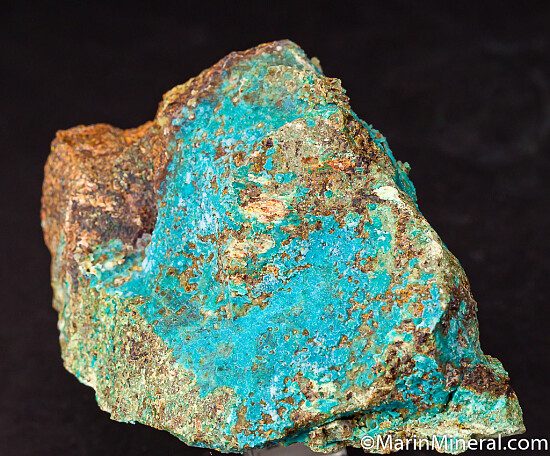 Colorful and rare specimen of sparkling Quartz over Chrysocolla from an obscure Nevada copper mine. Bright turquoise-blue chrysocolla covers the majority of the front face with lesser amounts of Chrysocolla on the other faces. The drusy Quartz layer makes it even more vivid and bright. A rare and showy example from an uncommon locality.