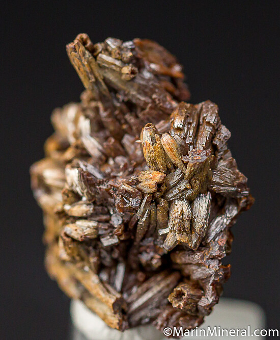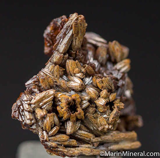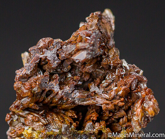 Elongated, slightly curving crystals of arsenian Vanadinite var. Endlichite. A nice thumbnail sized specimen composed of solid crystals. Out of an old collection from the 1980s.