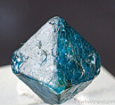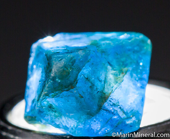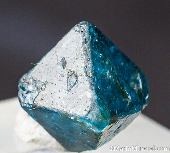 Translucent to transparent blue Gahnite crystal, the zinc rich end member and one of the rarer species in the Spinel group of minerals. A complete octahedron with chips on 3 of the tips, otherwise perfect and one of the sharper larger sized crystals I've had of this material. These were first discovered in 2001 and are found mostly of industrial quality. Though they don't get very large, the color is spectacular. The GIA has written a nice article about these crystals published in Gems & Gemology, Fall 2019, Vol. 55, No. 3.