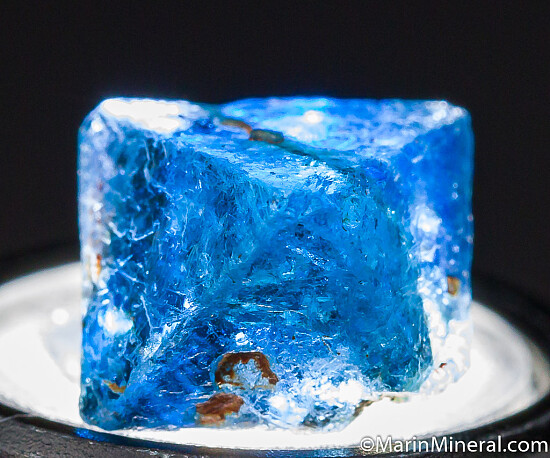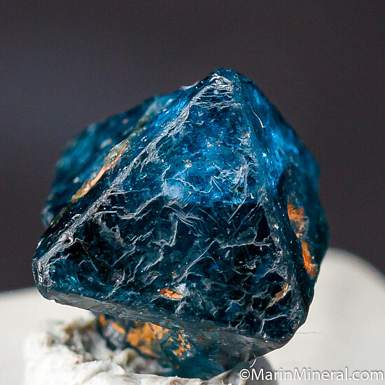 Transparent blue Gahnite crystal, the zinc rich end member and one of the rarer species in the Spinel group of minerals. A mostly complete octahedron with a slight chip on the tip of 1 corner and a indentation from natural contact with another crystal. Translucent to transparent crystal, a good sized, sharply formed example for the find. These were first discovered in 2001 and are found mostly of industrial quality. Though they don't get very large, the color is spectacular. The GIA has written a nice article about these crystals published in Gems & Gemology, Fall 2019, Vol. 55, No. 3.