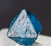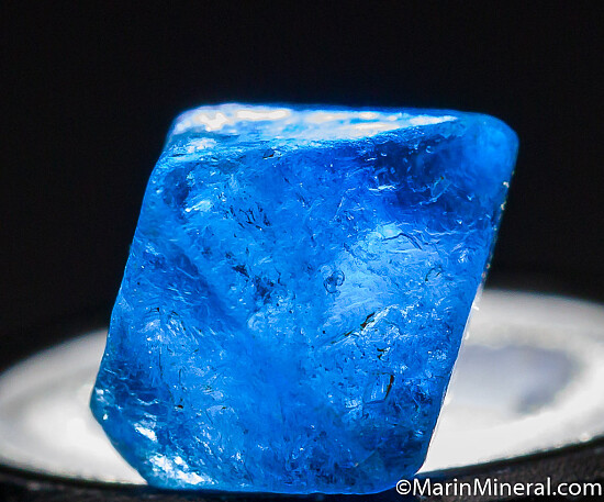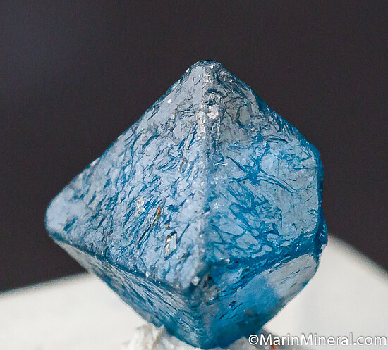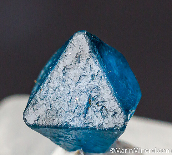 Translucent to transparent blue Gahnite crystal, the zinc rich end member and one of the rarer species in the Spinel group of minerals. A complete octahedron with small chips on 2 of the tips, otherwise perfect and a sharper than most example of this material. These were first discovered in 2001 and are found mostly of industrial quality. Though they don't get very large, the color is spectacular. The GIA has written a nice article about these crystals published in Gems & Gemology, Fall 2019, Vol. 55, No. 3.
