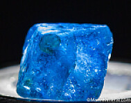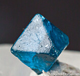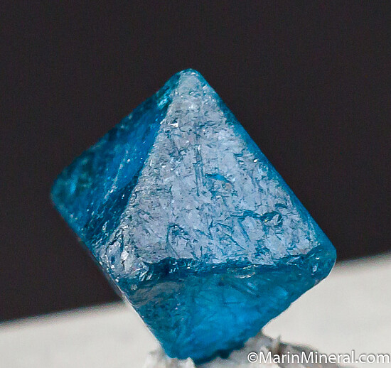 Transparent blue Gahnite crystal, the zinc rich end member and one of the rarer species in the Spinel group of minerals. A complete octahedron with a slight chip on the tip of 1 corner. Sharply formed example for the find. These were first discovered in 2001 and are found mostly of industrial quality. Though they don't get very large, the color is spectacular. The GIA has written a nice article about these crystals published in Gems & Gemology, Fall 2019, Vol. 55, No. 3.