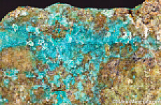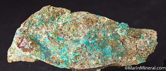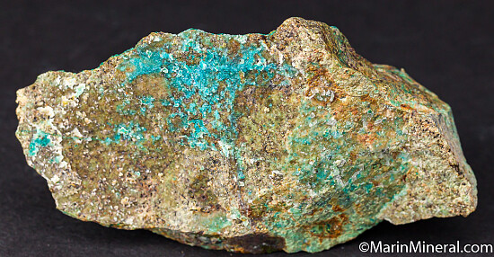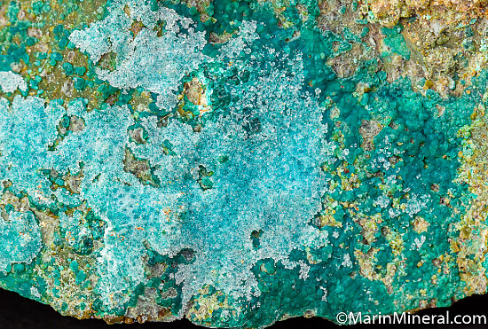 Colorful and rare specimen of sparkling Quartz over Chrysocolla from an obscure Nevada copper mine. Bright turquoise-blue chrysocolla covers the majority of the front face with lesser amounts of Chrysocolla on the other sides. The drusy Quartz layer over parts of the Chrysocolla makes it even more vivid and bright. A rare and showy example from an uncommon locality.