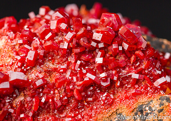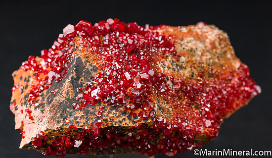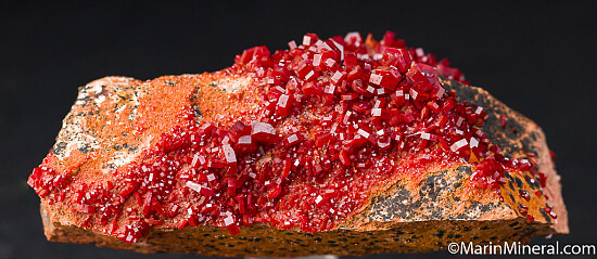 Bright red Vanadinite crystals that contrast welll against the tan rock matrix. Good crystals all around, in fact crystals can be found on all sides. Minor if any damage and also no 'crud' on the crystals - they are bright and shiny on all sides.