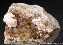 Highly lustrous and curving crystals of Dolomite on crystals of translucent dark honey-colored Calcite. The Dolomite cluster is 2cm in size. Undamaged.