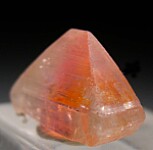 Bright pinkish orange single Euclase crystal from recent finds in Bahia. A wide, well formed crystal with good transparency. It's color zoned with more pink down the center and more orange on the sides. Complete and undamaged.