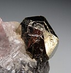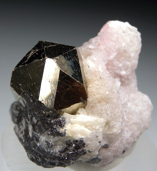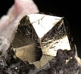 Complete and undamaged single Pyrite crystal on a mtrix of Calcite and Graphite from the Merelani Tanzanite mines. The Pyrite has uniform shape and bright, brassy metallic luster.