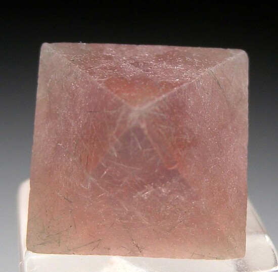Exceedingly sharp single octahedral Fluorite crystal from Inner Mongolia, China. A perfect floater of translucent to transparent pink Fluorite textbook in form. High quality, complete crystal in excellent condition.