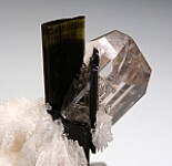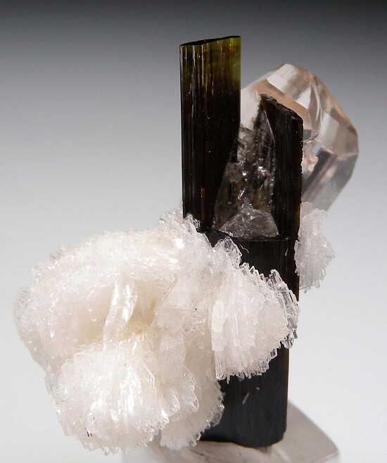 Cluster of dark green Tourmaline, a water clear Topaz, and Albite. Interestingly, the Topaz interferred with the growth of the Tourmaline causing it to grow in a hollow shape. The Topaz is 1.7cm, doubly-terminated, and a jewel.