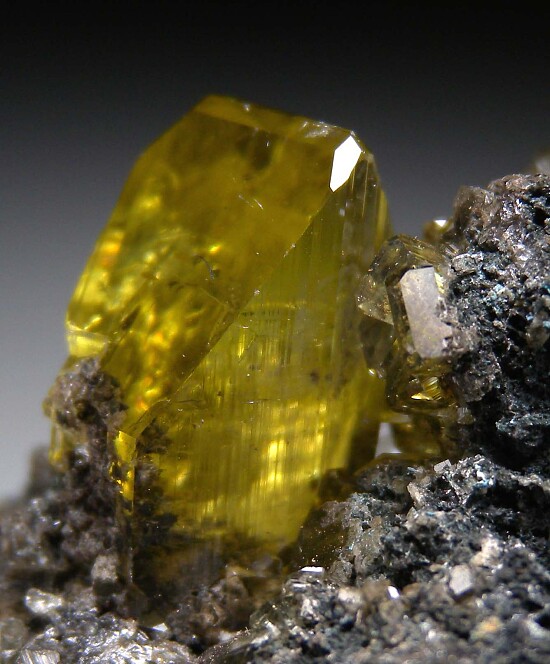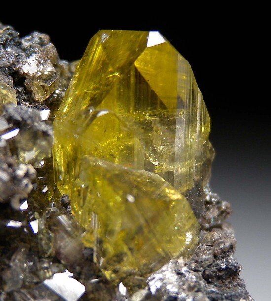Exquisite yellow Anglesite crystals from Touissit, the source of the world's finest Anglesite. The best Anglesite were found decades ago from this now closed mine and top quality crystals are hard to find. This Anglesite has excellent transparency, fine lemon yellow color, aesthetic arrangement on the matrix, and is undamaged. There are two primary crystals and a number of smaller crystals present.