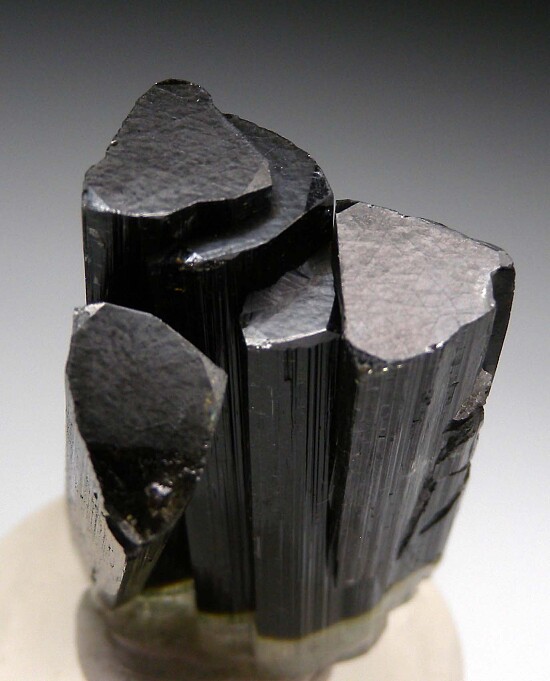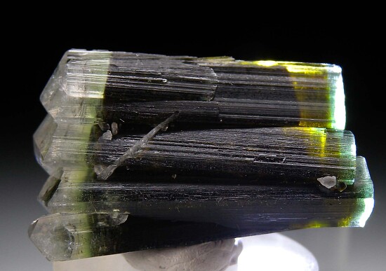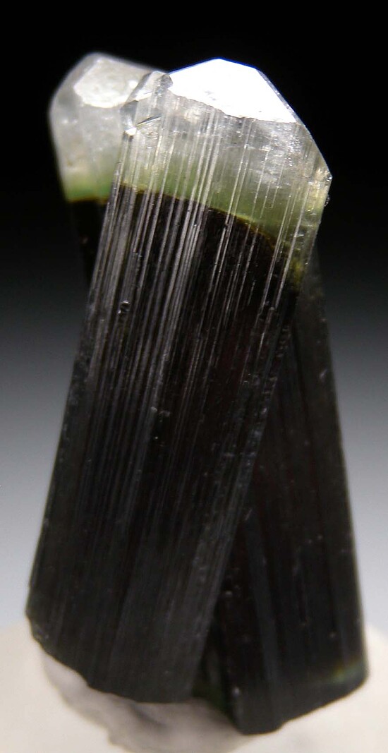 Five parallel grown, doubly-terminated Tourmaline crystals from Stak Nala. One end has pyramidal, colorless (Achroite) terminations and the other has flat, multi-hued green terminations. There is a chip on one of the flat terminations, otherwise it's well crystallized and perfect all around, a floater.