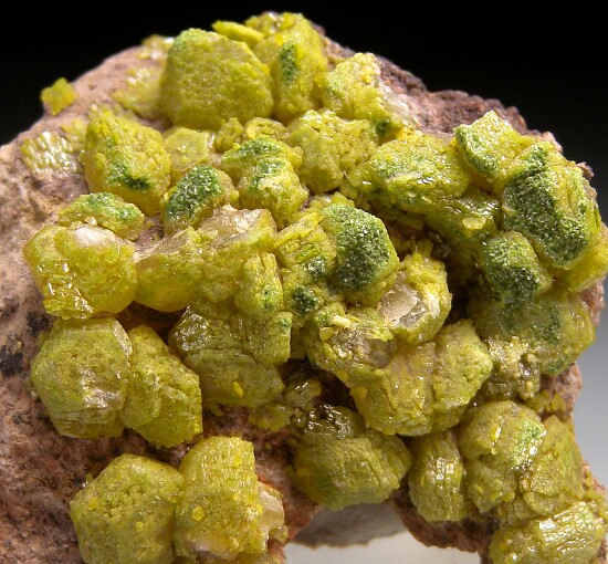 Tabular hexagonal prisms of Mimetite on matrix from the Mount Bonnie Mine. The crystals are a translucent yellow but are coated with green Duftite giving an overall yellow/green coloration. When you hear 'Duftite', one typically thinks of Tsumeb, however the Duftite from Mt. Bonnie is equally superb, if not better. This locality is closed and these are hard to find now, especially the less common ones with so much Duftite.