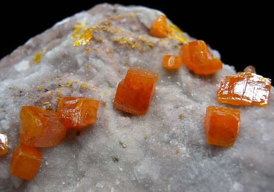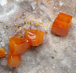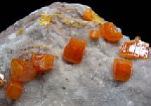 Sharp orange Wulfenite crystals on drusy white Calcite crystals. Excellent color, a bright orange without typical brown tones, and good color is important in these. There is chipping on two crystals on the far edge, however the majority are pristine. Valued at $300.