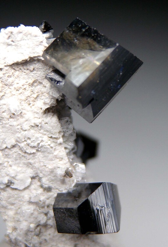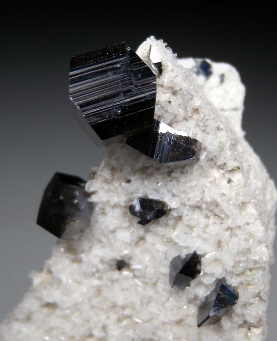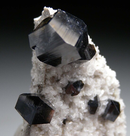A shard of matrix covered by white Albite crystals hosting several Anatase crystals of exceptional quality. There are 7 larger Anatase with the largest perched near the top and measuring 9 x 8 mm in size. Undamaged.