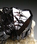 Highly lustrous cluster of twinned black Cassiterite on Muscovite. The cluster is 4.2cm wide and high luster of the Cassiterite contrasts nicely with the softer silvery blades of Muscovite.