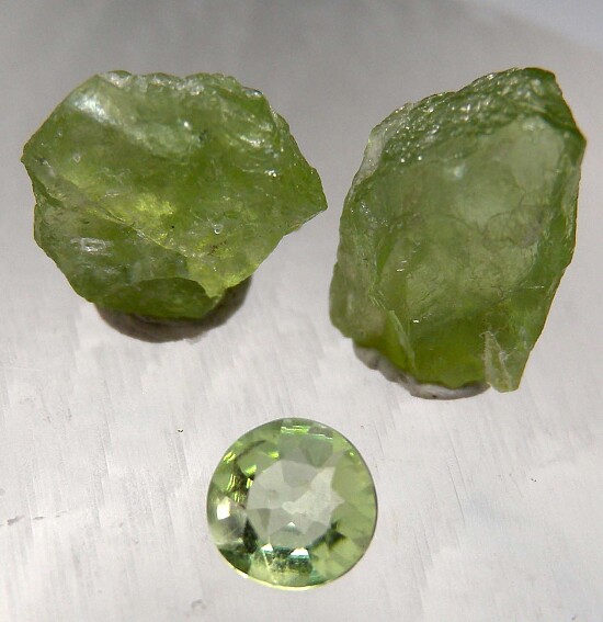 Rough and cut set of Peridot from Norway. Includes two rough crystals from Tafjord in western Norway and a slightly larger than 4mm round gemstone from the Ekremseter Olivine Pit, Almklovdalen, Vanylven, More og Romsdal, Norway.