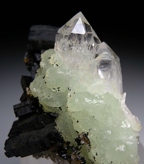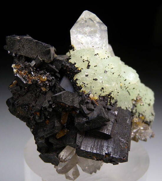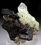 Well formed black Babingtonite crystals with light green Prehnite and transparent Quartz crystals. An excellent example from this now classic Chinese locality in pristine condition.