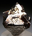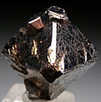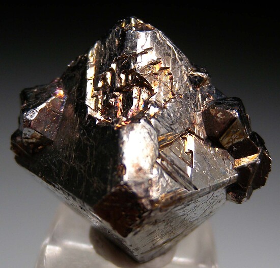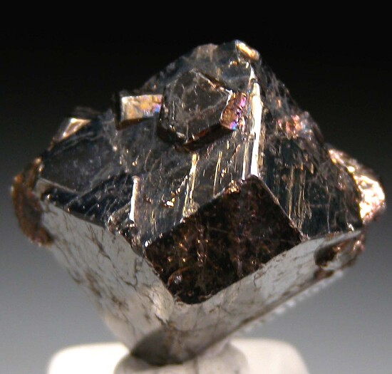 Complete single octahedral Carrollite crystal with a number of smaller intergrown crystals. This is an older piece with a slightly dark golden irridescent patina and an old Dirk Rheinlander collection number affixed to one side.