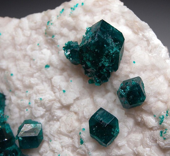 Emerald green Dioptase crystals on white Calcite. This one has both isolated individual crystals and a large cluster of crystals. The crystals reach 1.4cm in size and are translucent to transparent. A well balanced, quality Dioptase specimen.