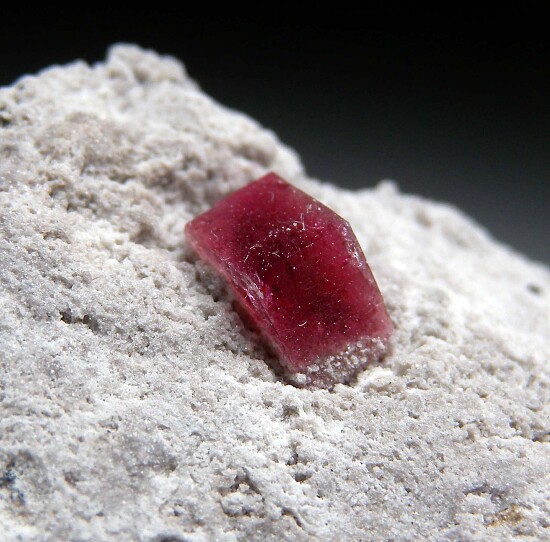Richly colored red Beryl crystal, 6mm wide, on Rhylolite matrix with a black cube of Bixbyite nearby. Though not as large as the Red Beryl crystals from the Violet Claims, the crystals from this locality are noted for there deep red color and associated minerals including Bixbyite and Topaz. Ex. Jon Sigerman collection.