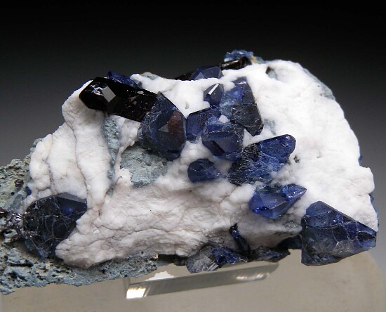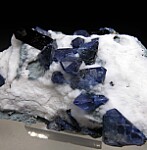 Deep blue Benitoite crystals to 9mm in white Natrolite, along with two Neptunite crystals on a schist matrix.