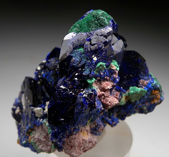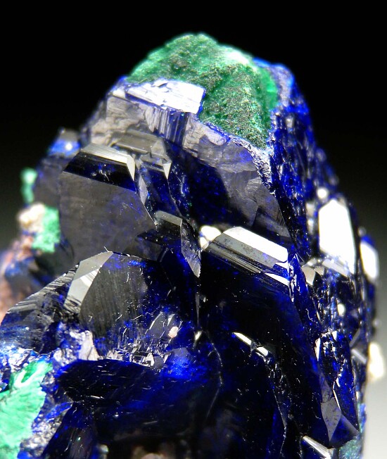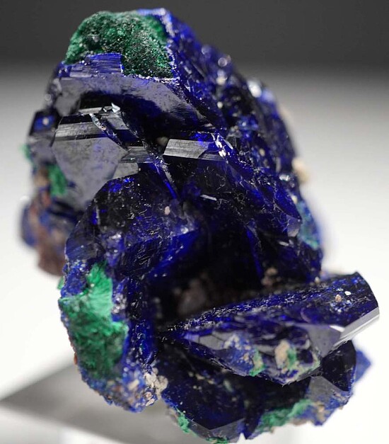Thick, chunky formation of interconnected Azurite crystals. The Azurite have high luster and display areas altered to Malachite and also flashes of bright 'electric' blue color. Great crystals!